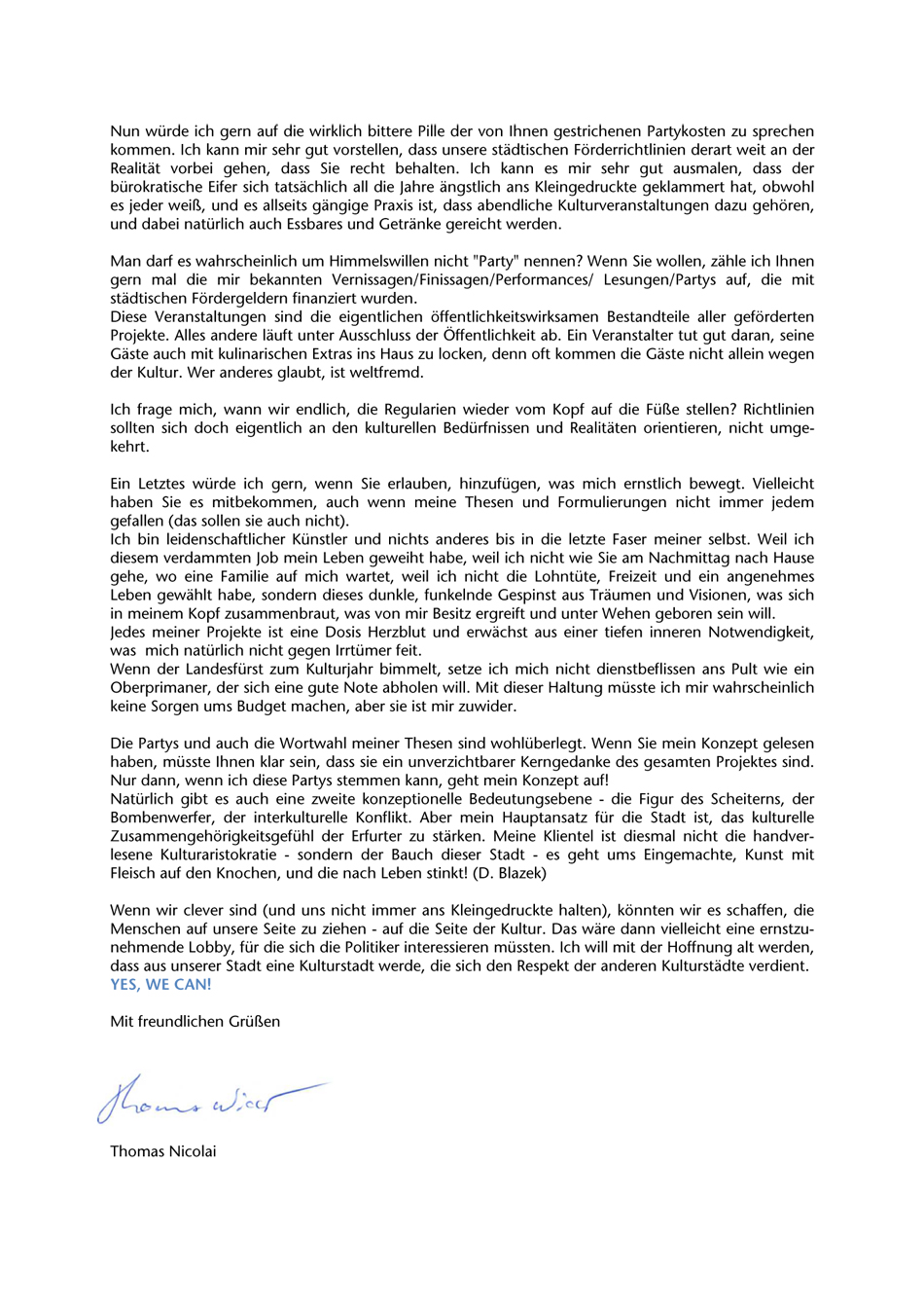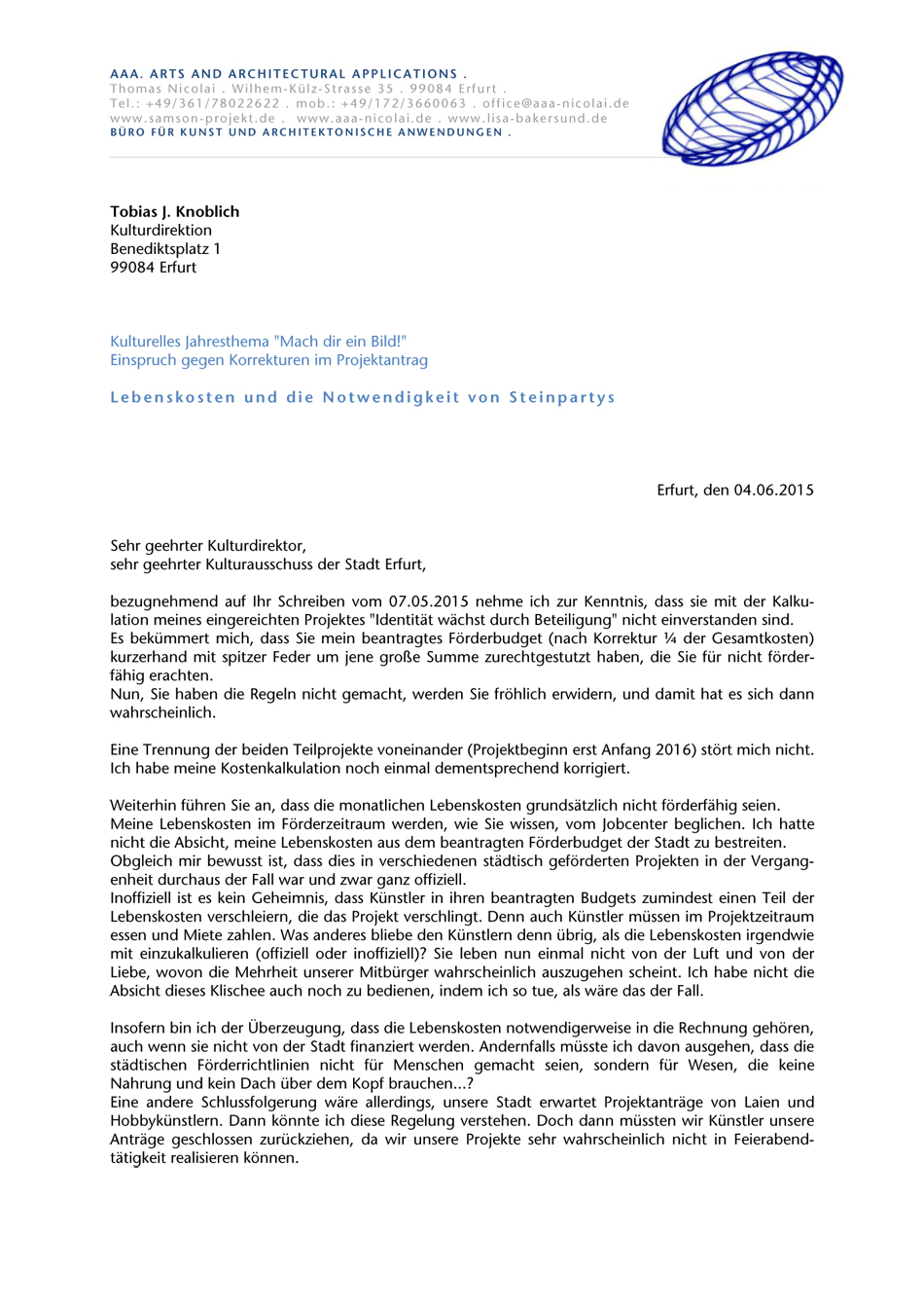 Einspruch gegen Korrekturen im Projektantrag Brief an die Kulturdirektion Erfurt